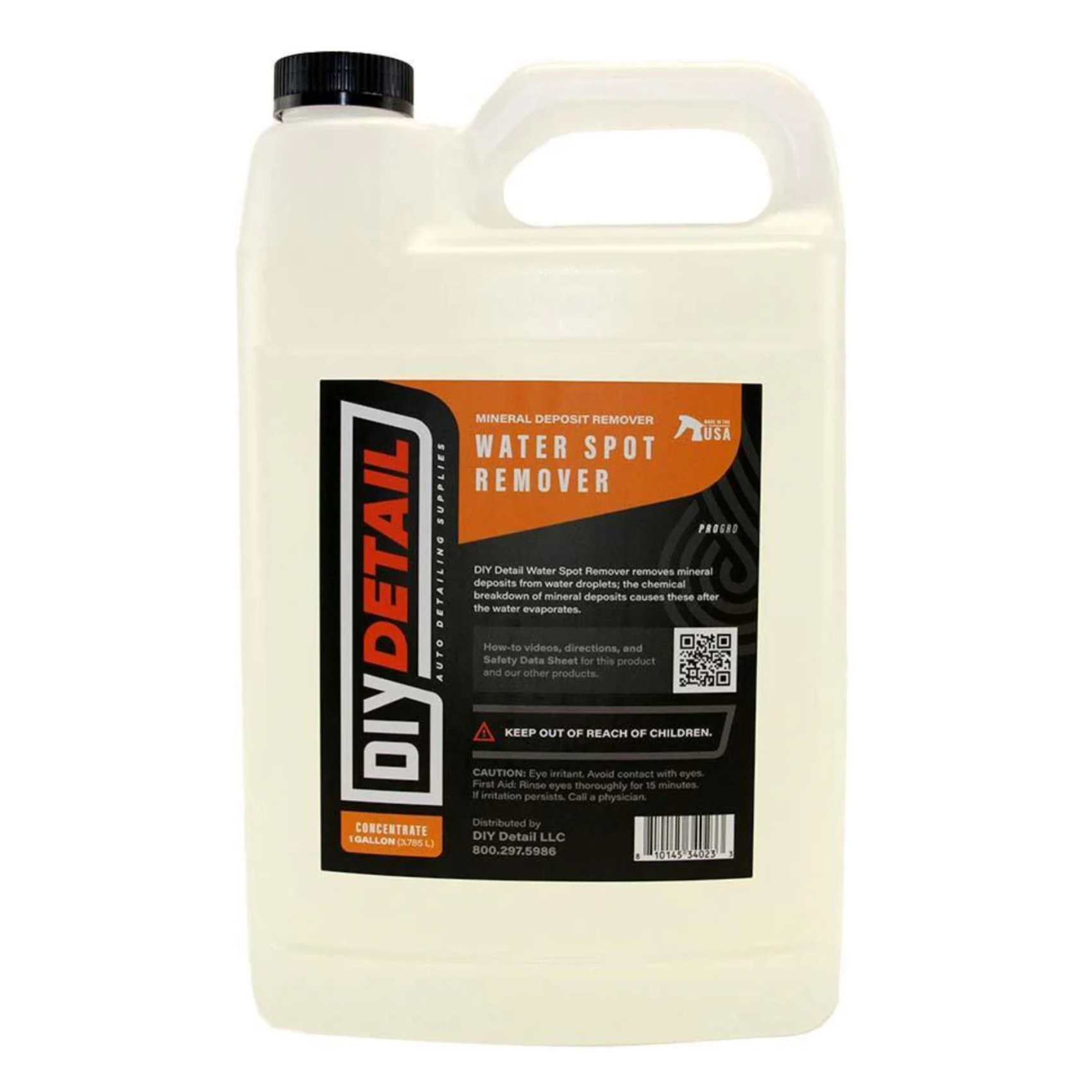 Simple to use spray-on, hose-off water spot remover formula that’s safe for all exterior surfaces. Water Spot Remover is a detailing spray that breaks down the difficult-to-remove mineral deposits that cause hard water spot etching. Polishing may be required to eliminate deep etching after using DIY Detail Water Spot Remover.