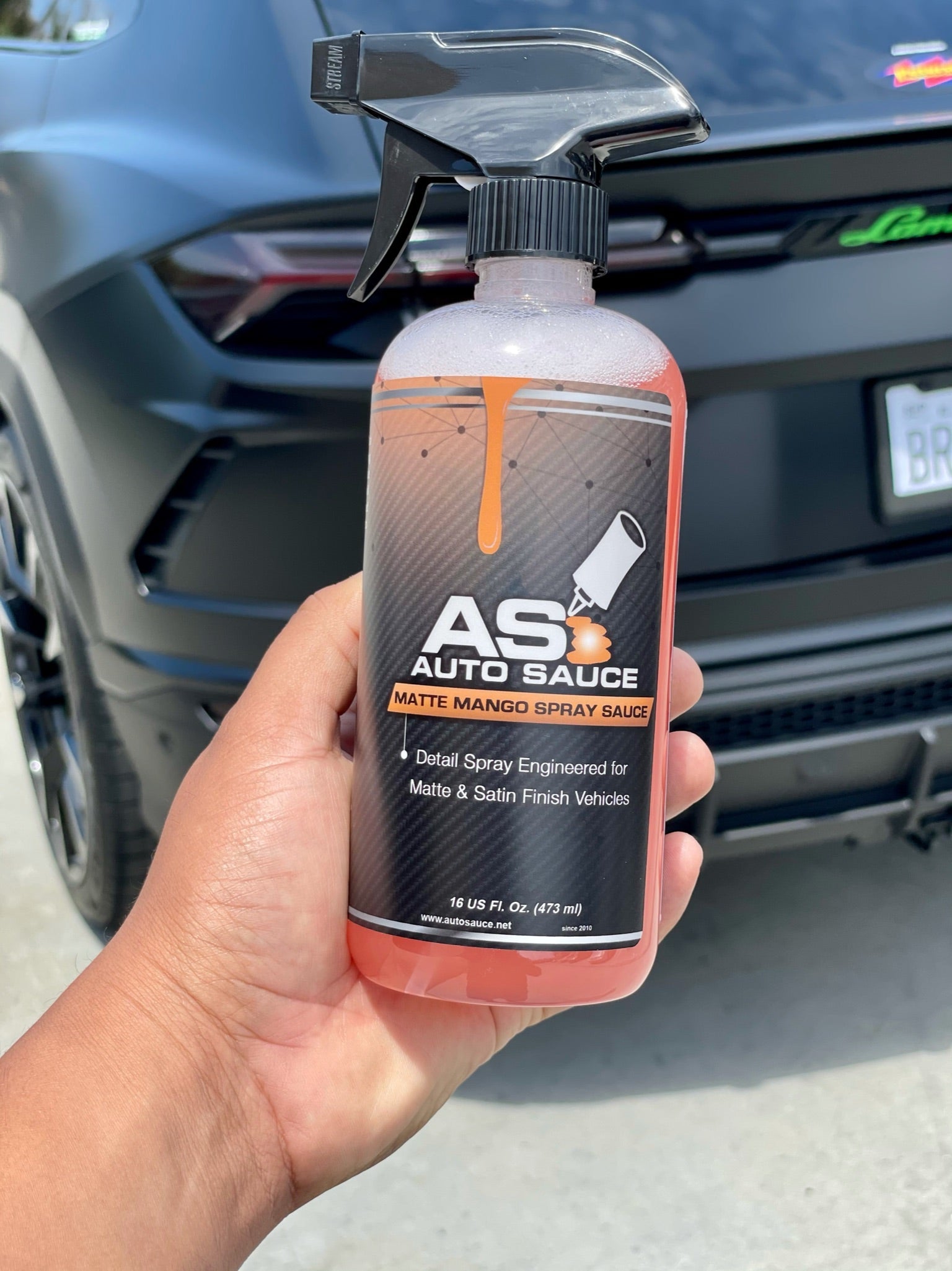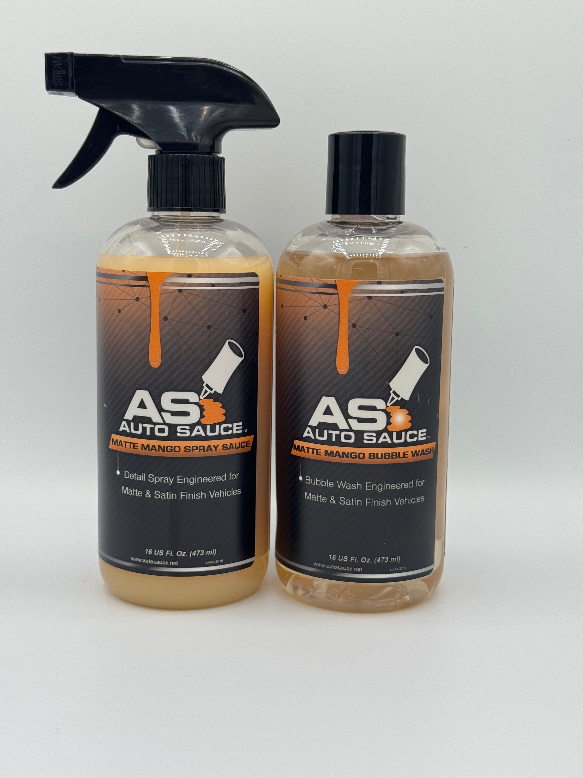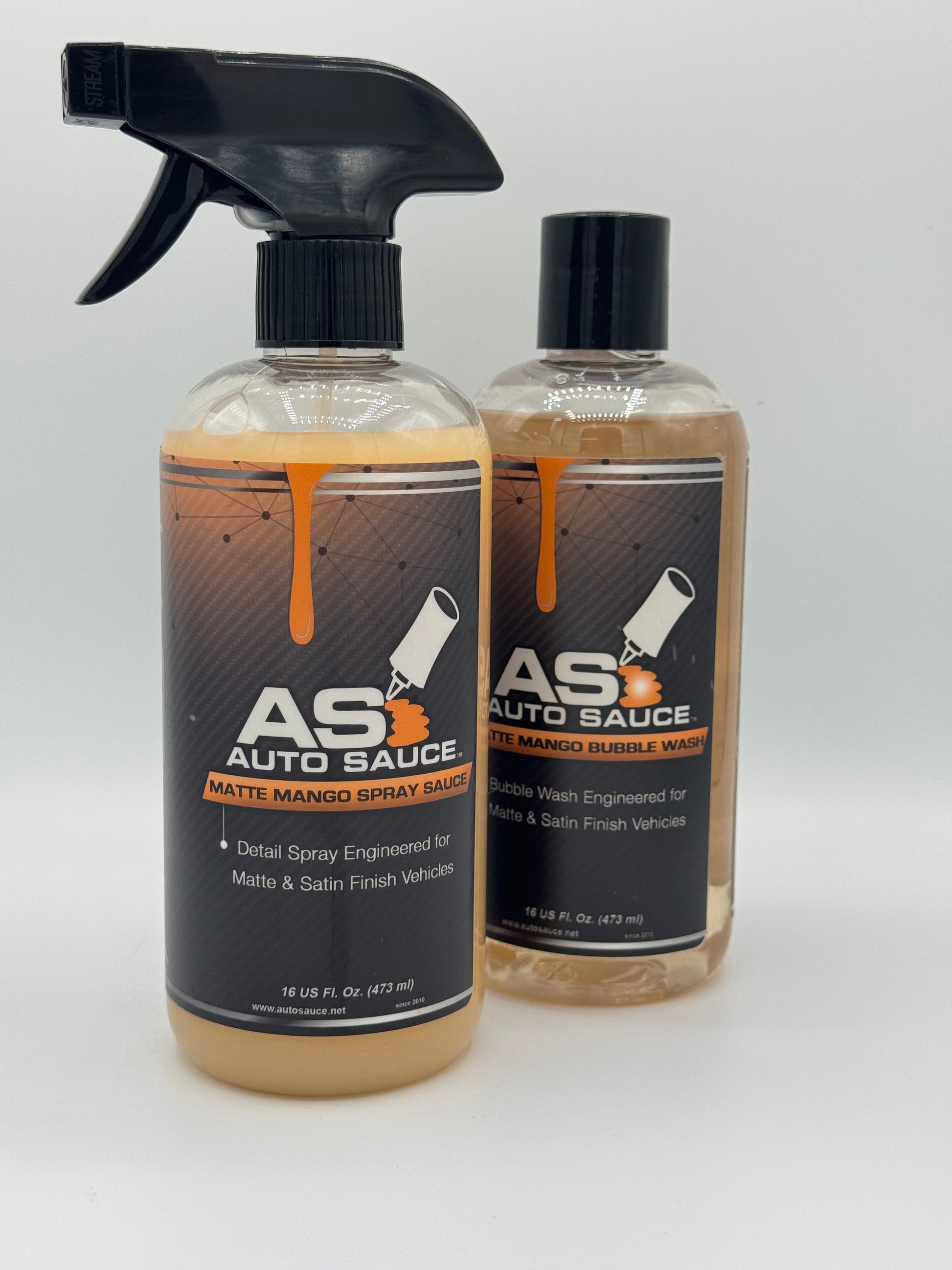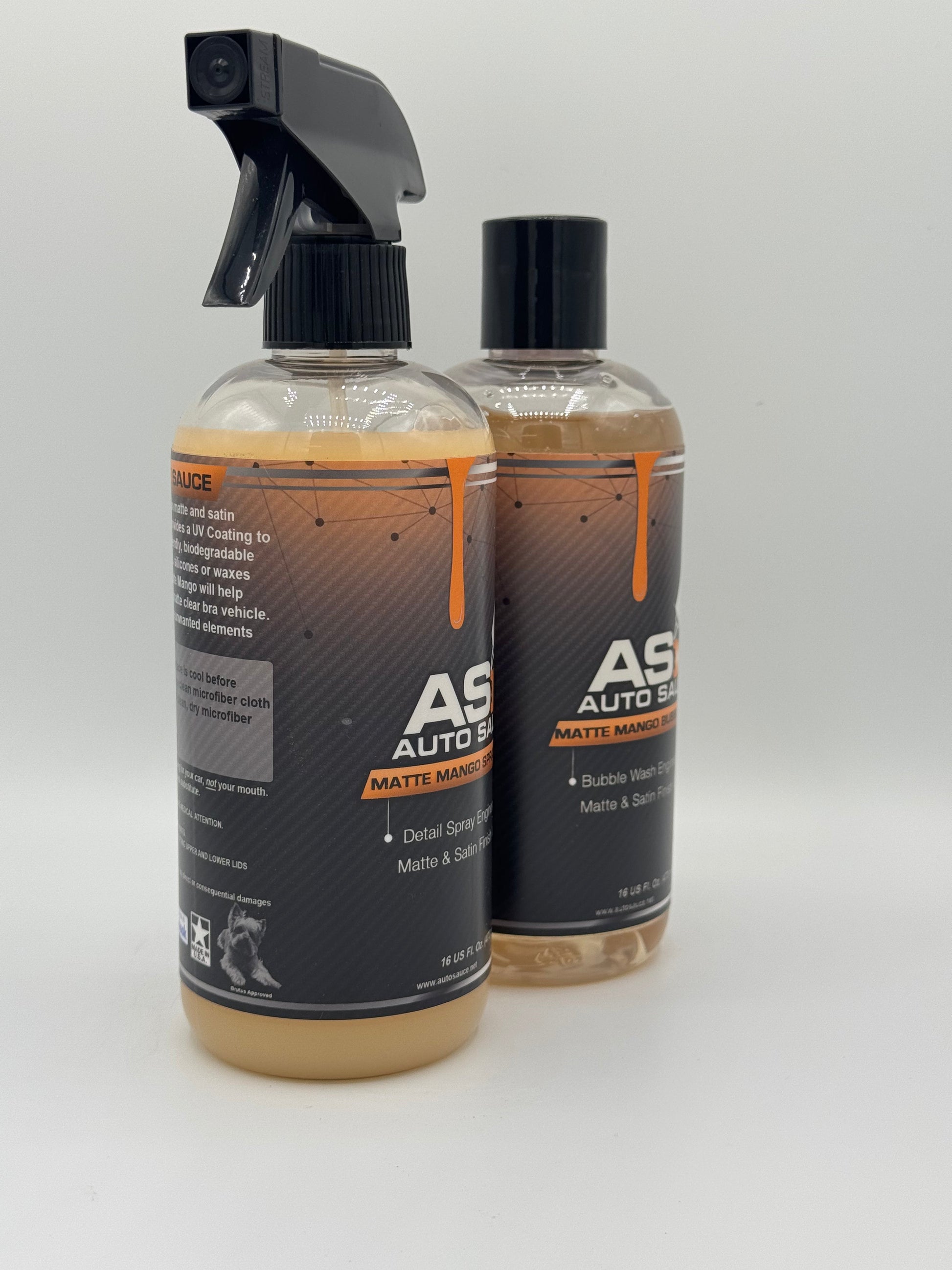 The first detail spray and bubble wash specifically formulated to clean your matte and satin painted or wrapped vehicle. Our Spray Sauce cleans and maintains while also providing a UV Coating to your finish. Matte Spray Sauce’s 100% surface friendly, biodegradable formula out performs hazardous solvent and surface cleaners and will not damage your matte or satin finish. Matte Mango Bubble Wash is made from a naturally derived citrus base, and is a hyper-concentrated wash and cleanser. Matte Mango is 100% surface friendly. Matte Mango contains natural citrus extracts that break down dirt and grime while lubricating surfaces and allowing debris to be gently rinsed off without scratching delicate finishes of matte wraps and paint. Free of artificial thickeners, silicones, gloss enhancers, colors or additives. Matte Mango Bubble Wash delivers the cleanest, streak free satin or matte finish. Always follow with Auto Sauce Matte Mango Spray Sauce to maintain a clean surface and protect between washes. This is the easiest way to prolong your matte or satin finish.