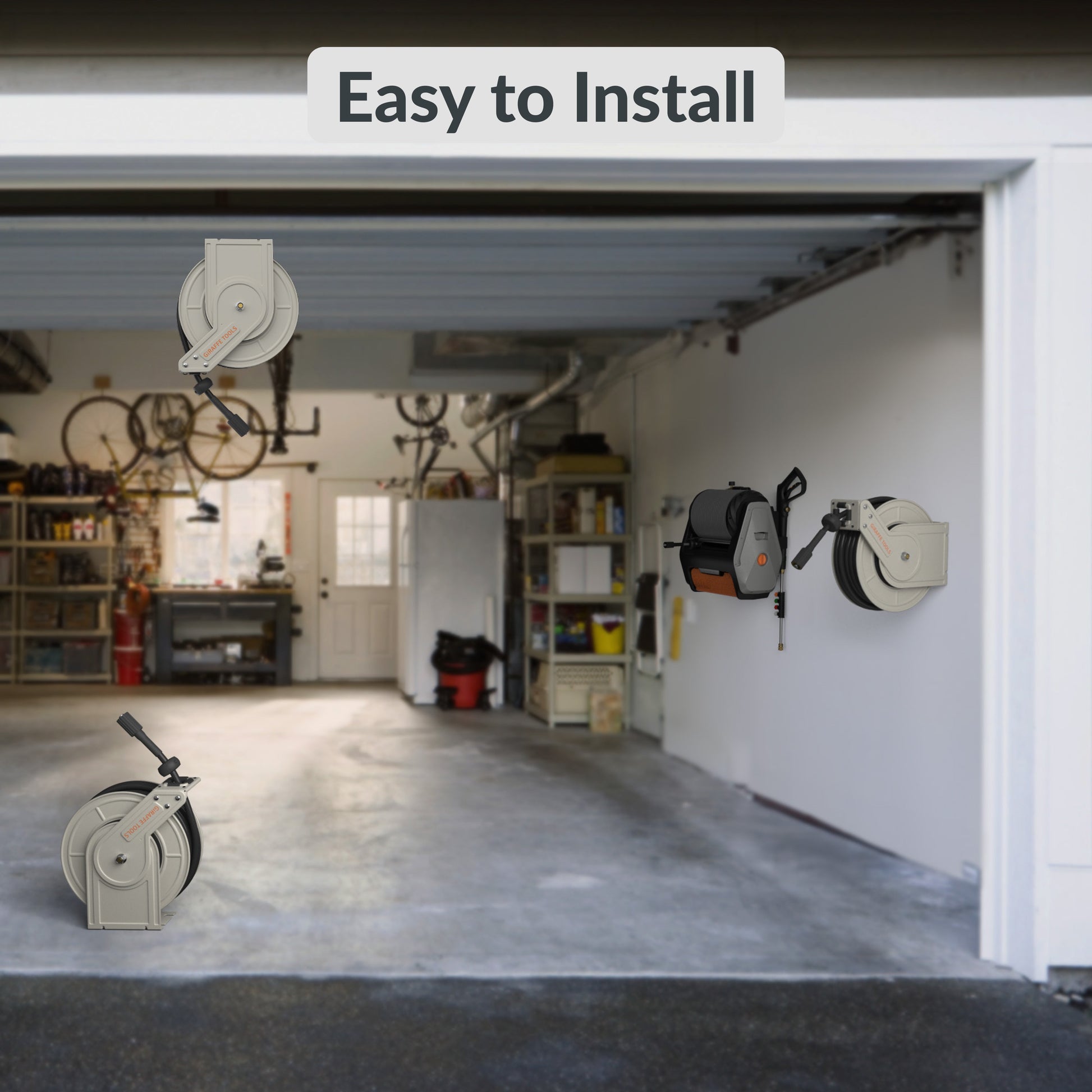 Giraffe Tools Retractable Pressure Hose Reel equipped with a locking mechanism, the hose can be adjusted to any length required, and is oil and abrasion-resistant, temperature range of -40 to 150 ℉, making it suitable for year-round use.